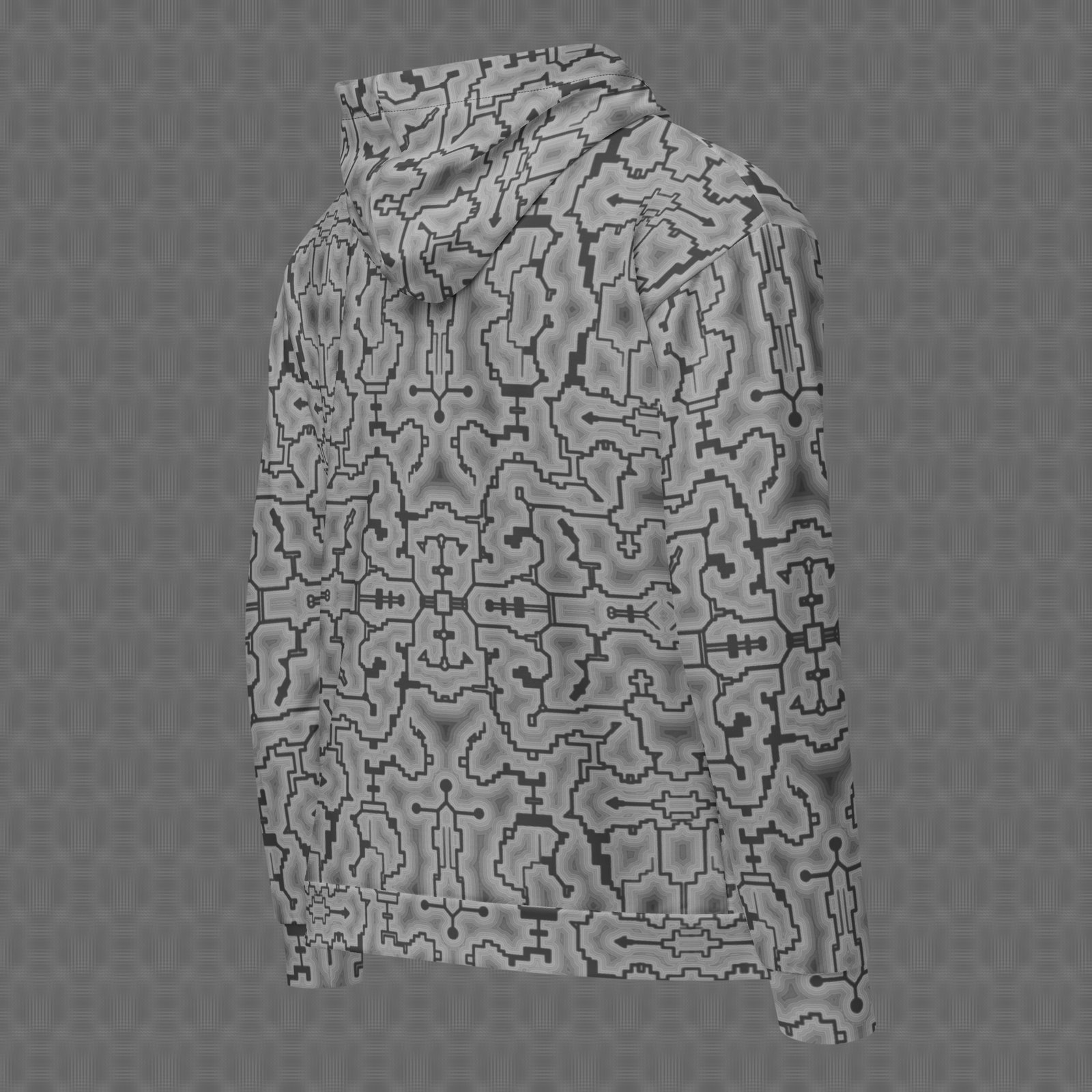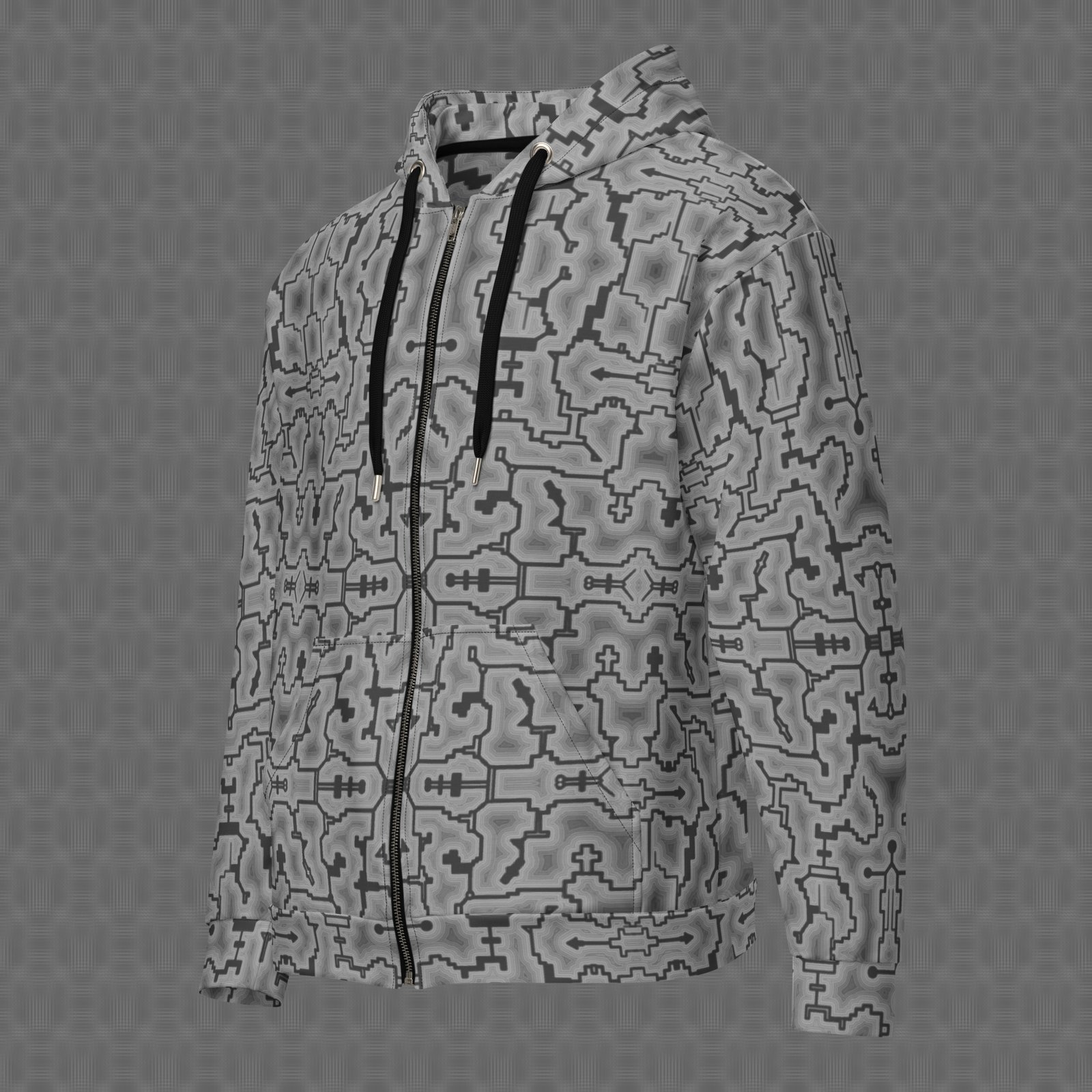 The Techno Shamanic Stone all-over zip hoodie features layered, gray carved-like linework in cool stone tones, merging circuit geometry with mineral textures for a grounded, monolithic ritual-tech aesthetic. Under UV and RGB lighting environments, the colors shift, glow, and transform, bringing the artwork to life in immersive settings, making it ideal for grounded ritual settings, ancient-site gatherings, and immersive environments where technology, earth, and permanence intersect.