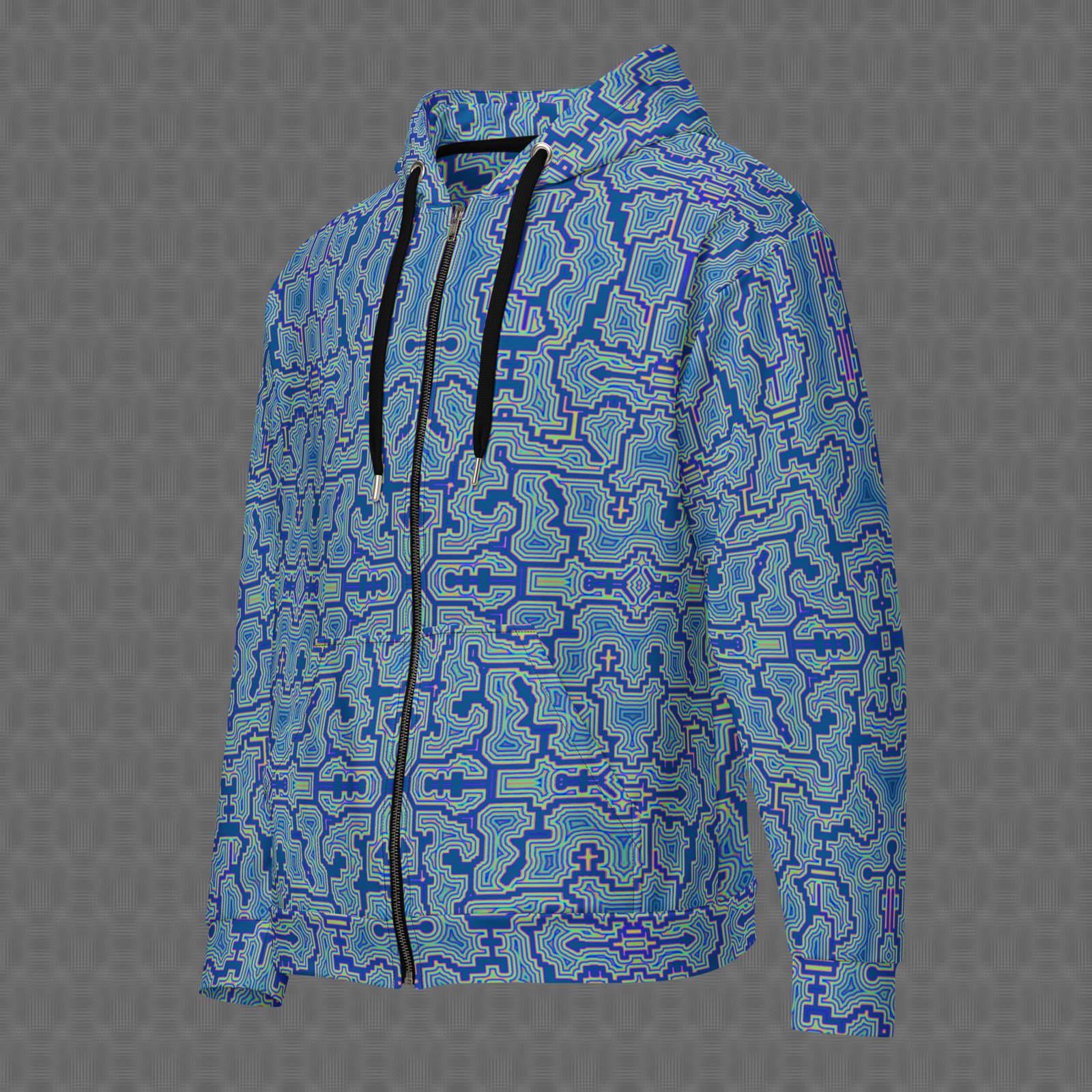The Techno Shamanic Water all-over zip hoodie features flowing, blue labyrinthine linework in cool aquatic tones, merging circuit-like geometry with liquid motion for a fluid, trance-inducing aesthetic. Under UV and RGB lighting environments, the colors shift, glow, and transform, bringing the artwork to life in immersive settings, making it ideal for fluid trance environments, aquatic-themed festivals, and spaces where water symbolism, hypnotic flow, and techno-ritual energy merge.