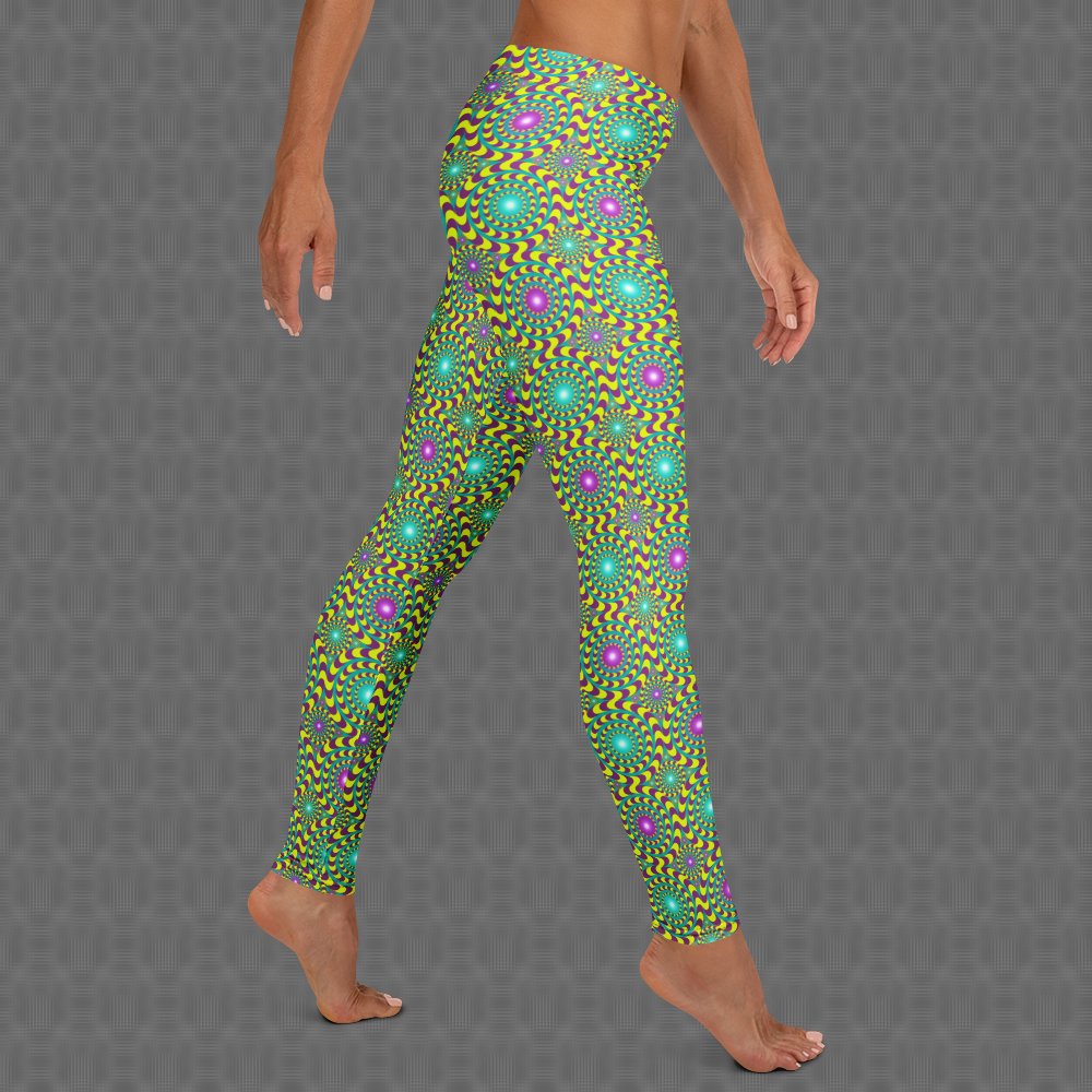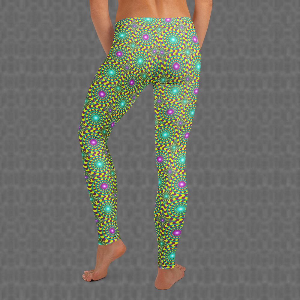 The UV-reactive, fade-resistant psychedelic print glows under blacklight and stays vibrant over time. Designed with an elastic waistband and triple-stitched seams for lasting durability, they also feature UPF 50+ sun protection. Sustainably made from recycled textiles, these leggings deliver high-performance comfort with bold visual impact.